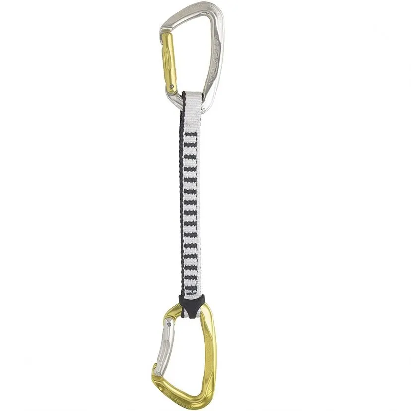 Disponibile nelle lunghezze di 11 cm e 20 cm ha i due moschettoni di colore diverso, per permetterti di posizionarli correttamente. La fettuccia è larga e resistente, comoda da afferrare quando ne hai bisogno. E’ presente anche il ferma fettuccia in gomma che tiene sempre in posizione il moschettone nel quale rinvierai la corda.
