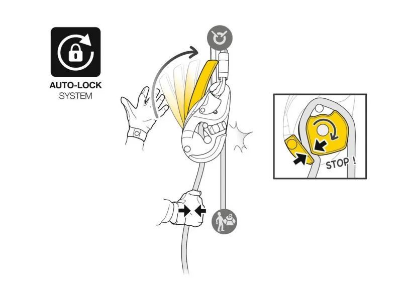 Quando l’utilizzatore lascia la maniglia, la corda è automaticamente bloccata nel dispositivo. Una volta bloccata la corda, questa può essere recuperata senza l’utilizzo della maniglia, permettendo per esempio di effettuare facilmente delle brevi risalite su corda (aggiungendo un pedale Footape o Footcord e una maniglia bloccante Ascension).