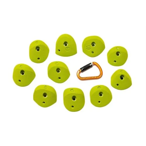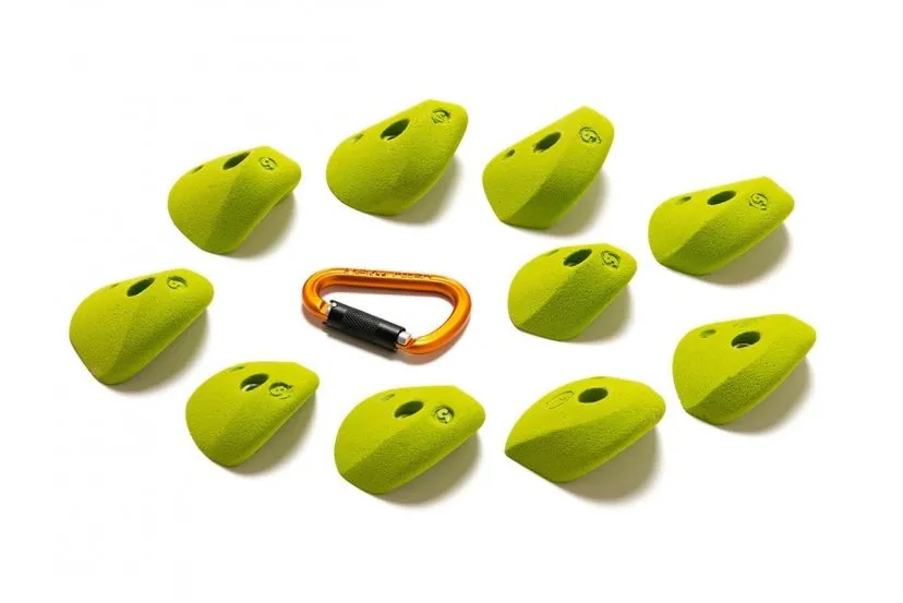Dieci prese da arrampicata Smog che puoi usare come buone maniglie in verticale o per tirare forte in strapiombi più o meno pronunciati. Sono fatte in poliestere.